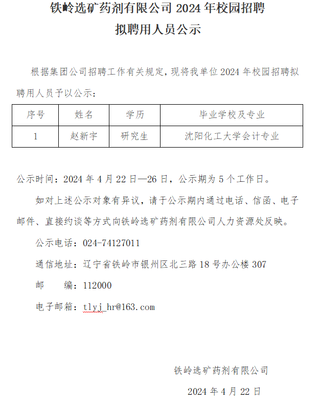 鐵嶺選礦藥劑有限公司2024年校園招聘 擬聘用人員公示