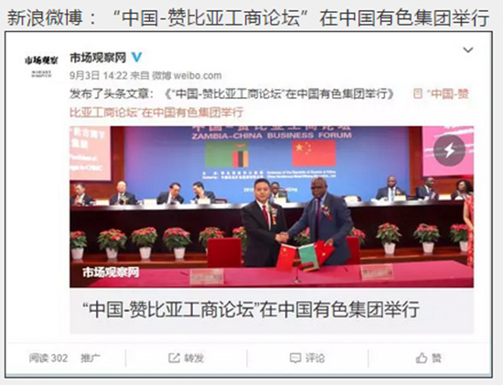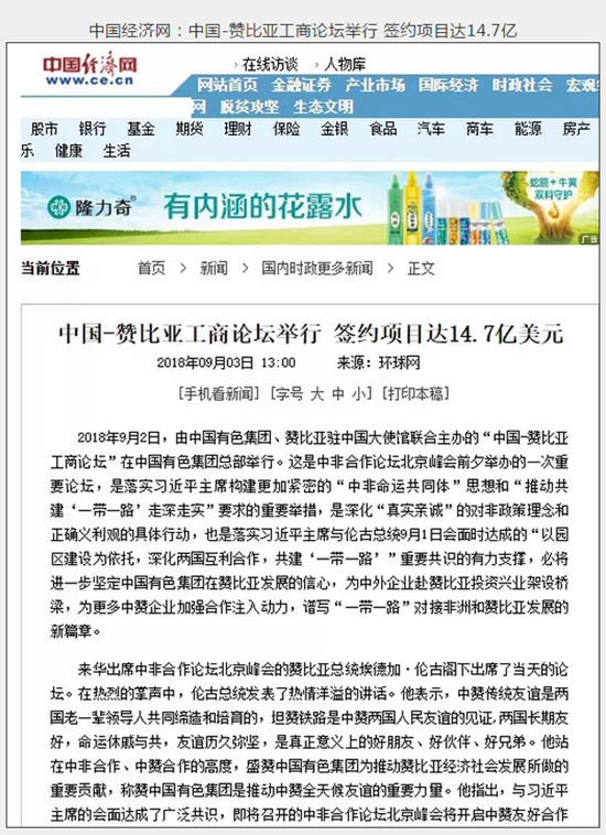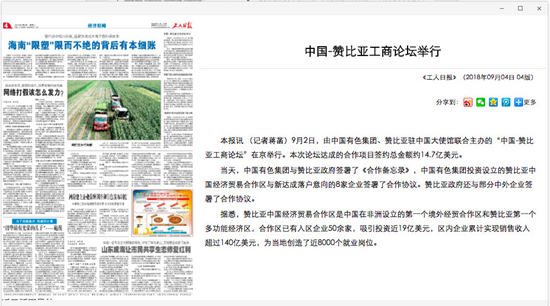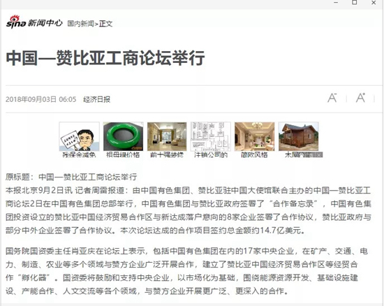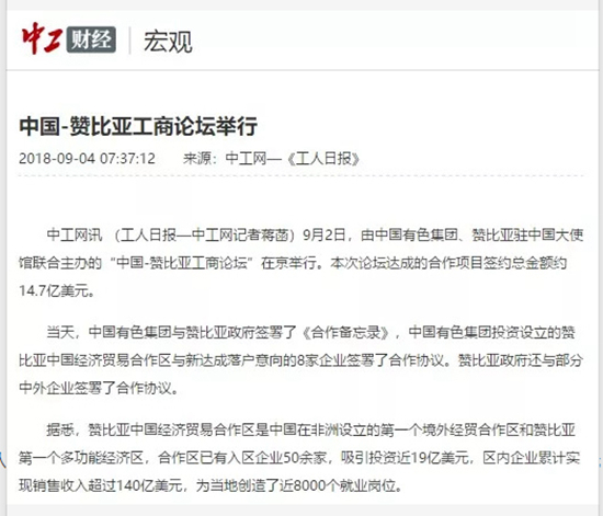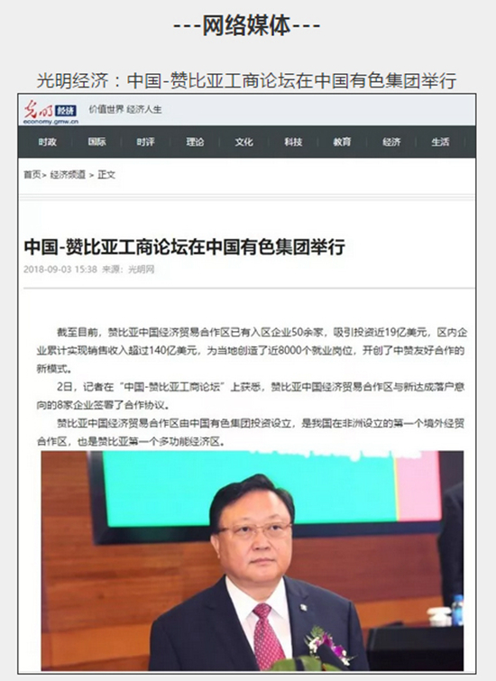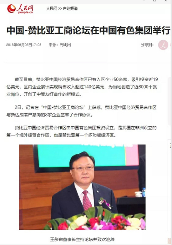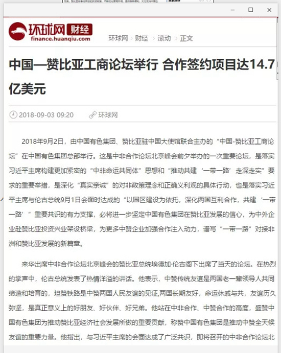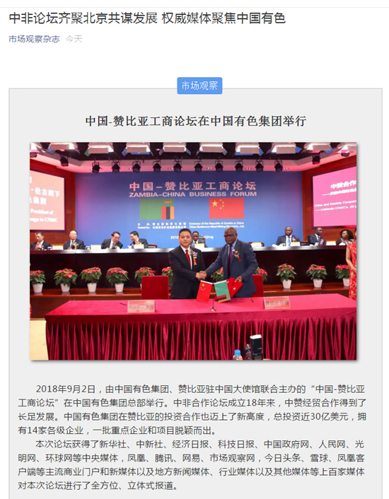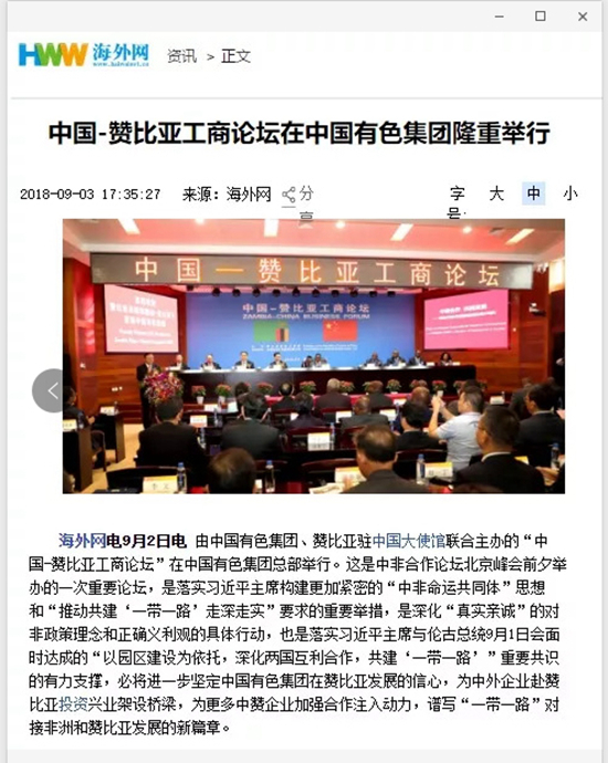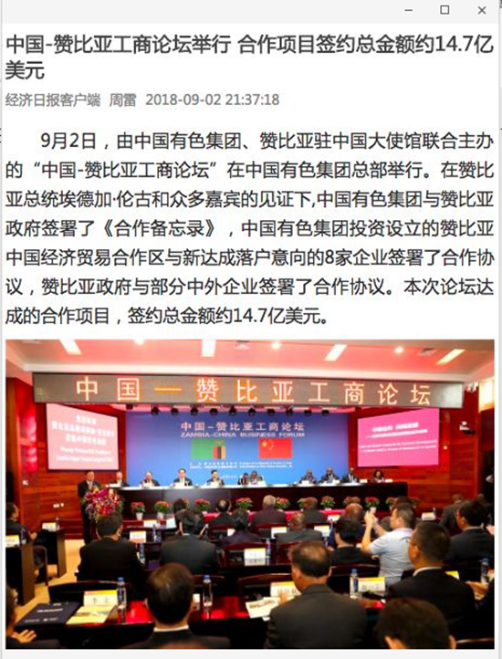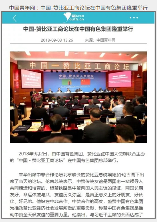 2018年9月2日,由中國有色集團、贊比亞駐中國大使館聯合主辦的“中國-贊比亞工商論壇”在中國有色集團總部舉行。中非合作論壇成立18年來,中贊經貿合作得到了長足發展。中國有色集團在贊比亞的投資合作也邁上了新高度,總投資近30億美元,擁有14家各級企業,一批重點企業和項目脫穎而出。