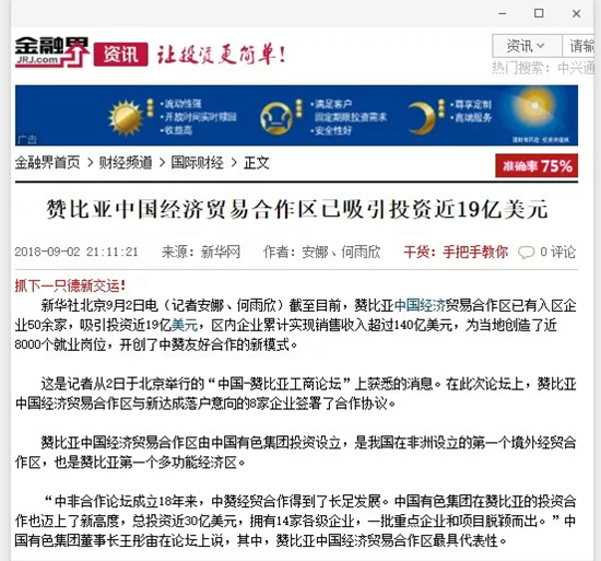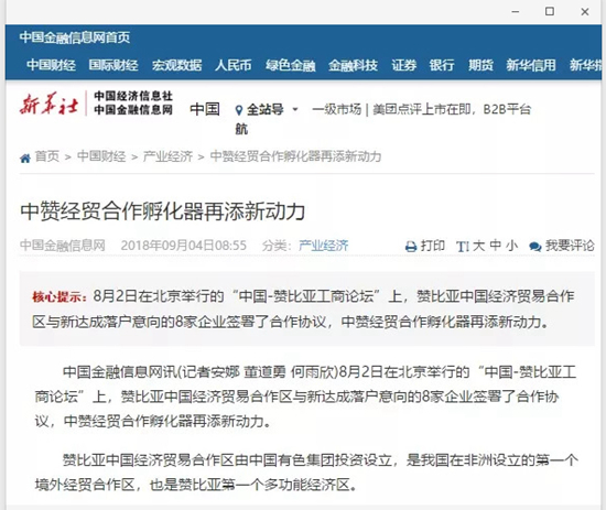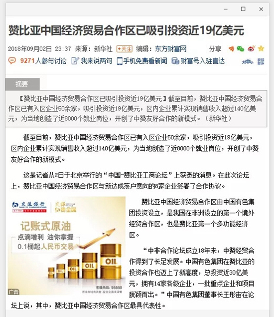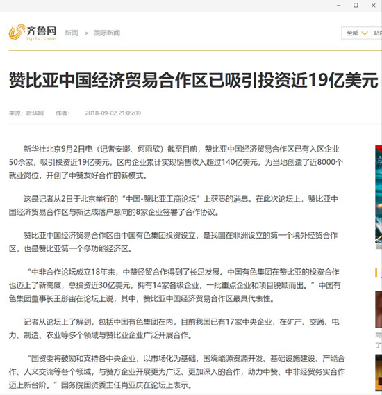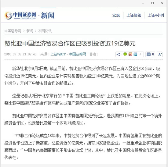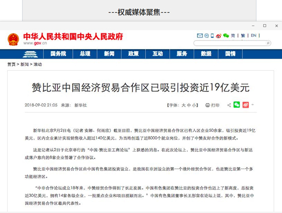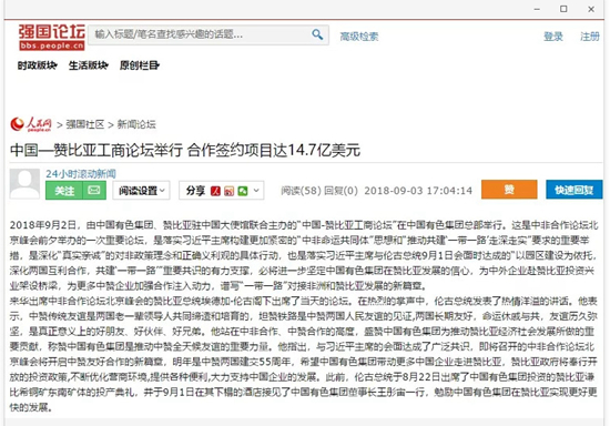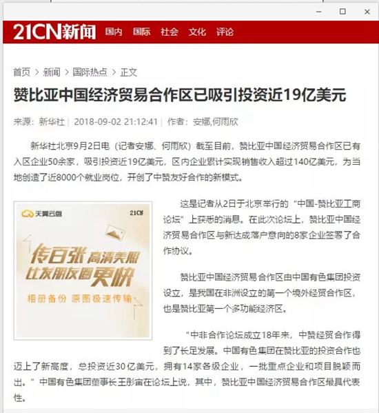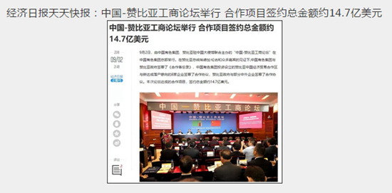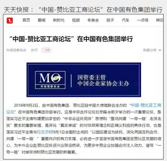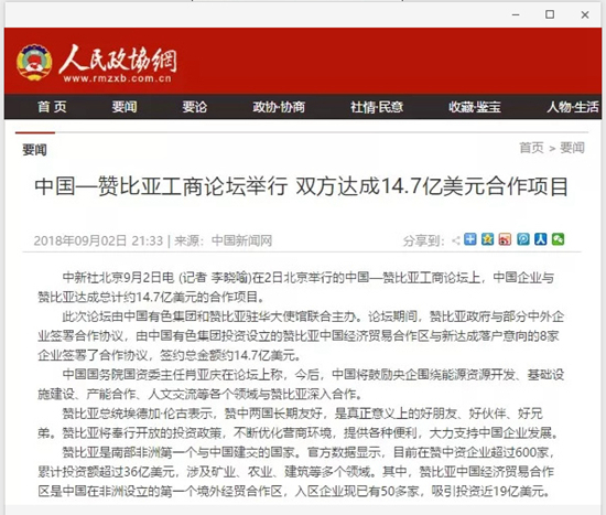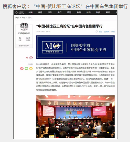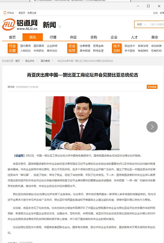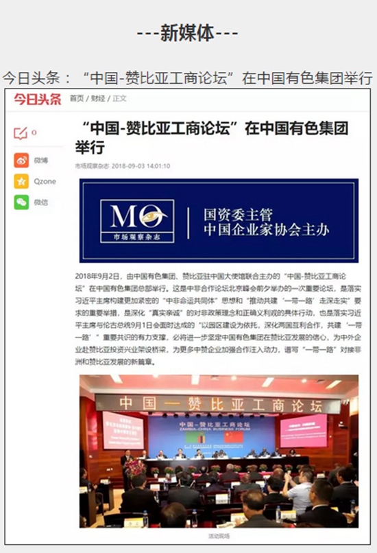 2018年9月2日,由中國有色集團、贊比亞駐中國大使館聯合主辦的“中國-贊比亞工商論壇”在中國有色集團總部舉行。中非合作論壇成立18年來,中贊經貿合作得到了長足發展。中國有色集團在贊比亞的投資合作也邁上了新高度,總投資近30億美元,擁有14家各級企業,一批重點企業和項目脫穎而出。